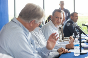 Durante la mesa de trabajo, las y los integrantes del Clúster Vitivinícola de Querétaro expusieron al Gobernador y las autoridades presentes sus inquietudes y propuestas para afianzar el sector a nivel nacional atendiendo los retos que enfrentan para mantener la Ruta Arte, Queso y Vino como la mejor opción para el turismo. Previo al encuentro, el Gobernador encabezó un recorrido por el viñedo, en compañía de los socios del Clúster.