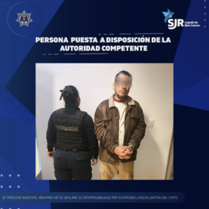 Una vez que los elementos de la SSPM-SJR realizaron la inspección correspondiente a Juan «N», quien de forma agresiva manifestó haber discutido con su pareja, pero no era motivo para que estuvieran presentes.En ese momento, Claudia «N», lo señaló como responsable de las lesiones físicas que presentaba y ante estos señalamientos fue detenido por el delito de violencia familiar en agravio a la fémina y puesto a disposición a las instancias correspondientes.