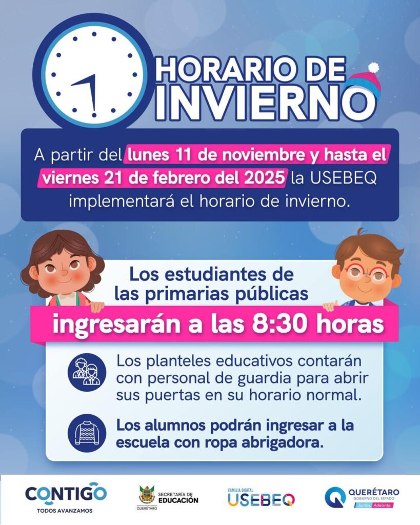 Con el fin de proteger a las y los estudiantes de enfermedades respiratorias y otros padecimientos propios de la temporada invernal, la coordinadora general de la Unidad de Servicios de Educación Básica para el Estado de Querétaro (USEBEQ), Irene Quintanar Mejía, informó que, a partir del 11 de noviembre del presente año y hasta el 25 de febrero de 2025, se retrasará media hora el horario de entrada en 865 escuelas primarias públicas generales e indígenas del turno matutino, a las que asisten 147 mil 602 alumnos.