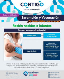• De seis a once meses de edad: el Consejo Estatal de Vacunación (COEVA) indicó que se aplicará la estrategia de la “dosis cero” (misma que no cuenta para el esquema de vacunación) de la vacuna SR o SRP a las niñas y niños de este grupo de edad con residencia en el municipio de Querétaro.